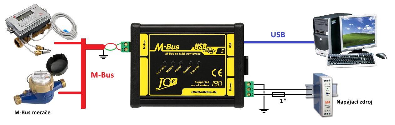 Doporučené zapojenie prevodníka s M-Bus zariadeniami, napájacím zdrojom a pripojením k počítaču prostredníctvom USB rozhrania.