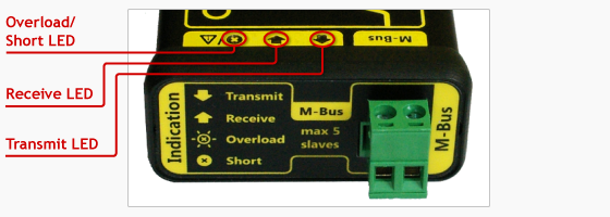 | Overload/Short | Indication of overload or short circuit on the M-Bus line. | red |